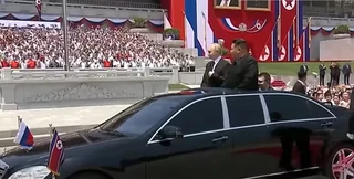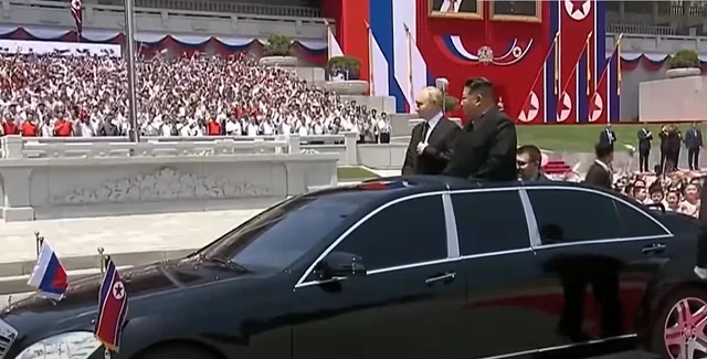 Як свідчать кадри з урочистостей, політики вирішили привітати населення, яке махало російськими прапорцями на центральній площі столиці КНДР. Першим в отворі на даху кабіни з'явився Кім Чен Ин. Потім поруч піднявся Володимир Путін. Далі з'явився ще один чоловік — перекладач, який допомагав їм спілкуватись. Усі троє мали поміститись у щілині, шириною півтора метра: стояли впритул один до одного, пояснили журналісти.