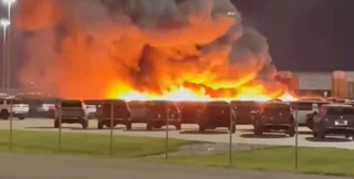 Пожежа виникла на парковці заводу Rivian | Фото: скриншот / YouTube