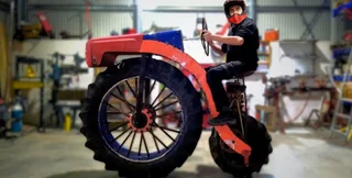 Незвичний мотоцикл нагадує велосипеди типу "павук", а колеса для нього запозичили в трактора. Його оснастили невеликим двигуном та автомобільним кермом.