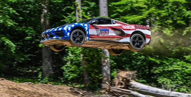 Зазвичай для подібних стрибків автомобілі модернізують та особливо посилюють їх підвіску. Одна Тревіс Пастрана вирішив скористатися цілком серійним Chevrolet Corvette C8 із 495-сильним V8. Єдиною зміною порівняно зі стандартною моделлю стало забарвлення в кольорах американського прапора. Навіть каркас безпеки у салоні не встановили.
