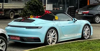 Звісно, кабріолет Porsche 911 з ялинкою на даху привертає увагу. До того ж, авто має нетипове забарвлення – блакитне з білими смугами. У Porsche це опція.