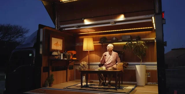 Новий Isuzu Elf MUV — вітальня на колесах, створена спільно з компанією Nippon Fruehauf. Стіна та дах його кунгу піднімаються та відкривають затишну кімнату, оздоблену деревом. Усередині встановили м'яке шкіряне крісло, лампу, стіл та полицю з кавомашиною.