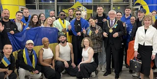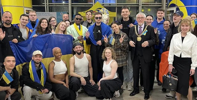 В аеропорту британського міста, яке цього року приймає Євробачення, українських виконавців разом із делегацією зустрів мер-лорд Рой Гледден, а місцевий хор виконав гімн України.