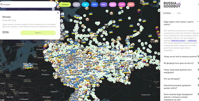 Звісно, покупка буде віртуальною, а перераховані кошти підуть на підтримку української армії та до різних волонтерських організацій. 80% коштів автор проєкту перераховуватиме у вигляді пожертвувань, а 20% залишатиме на розвиток сайту та нові сервіси. Таким чином, користувачі можуть підтримати ЗСУ та волонтерів, а також відчути себе власниками частини Росії.