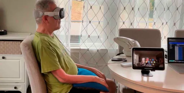 Один із перших тестувальників імплантата Stentrode Марк Джексон не може виходити на великі відстані зі свого будинку. За допомогою гарнітури віртуальної реальності Apple, під'єднаної до імплантату, він вчиться керувати iPhone, iPad і гарнітурою Vision Pro.