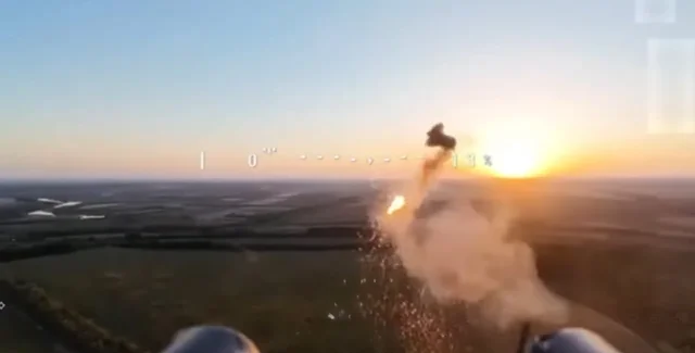 На відео можна побачити, як українські оператори виявляють ворожий розвідувальний БПЛА. Далі дрон-перехоплювач відкриває вогонь, в результаті чого безпілотник ЗС РФ вибухає у повітрі.