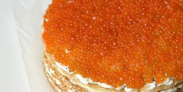 Млинці змастити начинкою, скласти один на один і між ними покласти шматочки лосося. Прикрасити верх ікрою і відправити на кілька годин у холодильник, щоб торт добре просочився.