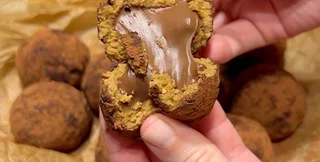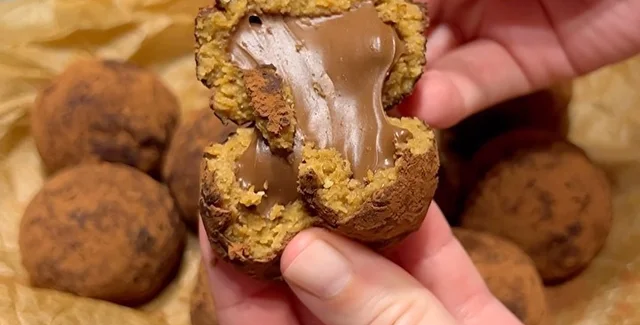З маси, що вийшла, сформувати кульки, сплющити їх у коржик, в центр якого викласти шоколадну пасту та заліпити подібно до пиріжка, а потім скатати в кульку. Обваляти тістечко в какао і викласти на блюдо. Простий, ситний і дуже смачний десерт готовий. Він ідеальний до чаю, кави та просто як частування.