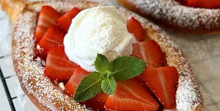 Подавати такий хачапурі краще зі свіжою полуницею, вершковим морозивом, цукровою пудрою та м'ятою.