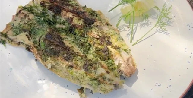 Скумбрію (або будь-яку іншу рибу) помити й обов'язково добре просушити рушником, щоб потім не стікав маринад. Очистити її від кісток, хвоста, плавників, розрізати вздовж хребта. Натерти маринадом з обох боків і залишити не менше ніж на 30 хвилин. Потім посмажити на оливковій олії з обох боків разом із кропом.