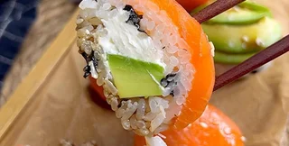 Готовий рис заправити рисовим оцтом, додати дрібно нарізані чипси норі. На шматочок харчової плівки викласти червону рибу, рис, злегка придавити, у центр покласти сир і шматочок авокадо.