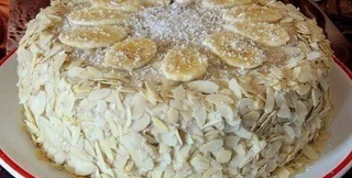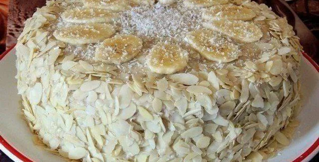 Коржі змастити рясно кремом, верх і боки торта — теж. Прикрасити торт шматочками банана, мигдалем і кокосовою стружкою.