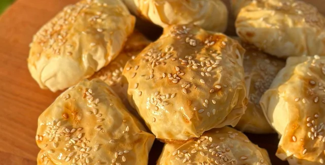 Сформовані пиріжки викласти на деко, застелене пергаментом. Змастити яйцем і посипати кунжутом. Випікати в духовці, розігрітій до 180 градусів, до золотистого кольору приблизно 20-30 хвилин.