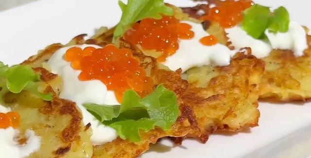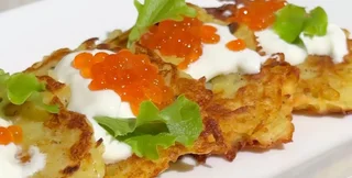 Деруни — це оладки з тертої картоплі, обсмажені на олії до рум'яної скоринки з обох боків. Багато хто готує цю страву, додаючи до складу зелень, різні спеції, м'ясний фарш, шинку та сир, і щоразу вона виходить дуже смачною. Сьогодні рекомендуємо приготувати деруни з ікрою лосося за рецептом Поліни, автора кулінарного блогу polli_cooking.