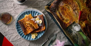 Готовий млинець наріжте на порційні квадрати і подавайте до столу.