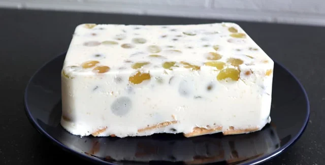 Це торт готується дуже швидко і без випічки, лише з печива і фруктів. Він простий у приготуванні, але дуже смачний, особливо з виноградом кишмиш, в якому немає кісточок. Рецептом поділились на сайті Vse Smachno.