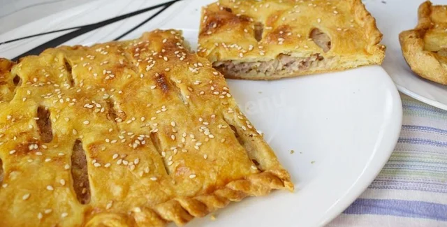 Заздалегідь розморожене тісто розгортаємо на присипаній борошном поверхні в два пласти, відповідно розміру листа або форми для випічки. Деко змащуємо маслом і кладемо на нього один пласт тіста. Поверх його рівним шаром викладаємо м'ясну начинку. Покриваємо все другим пластом тіста і краї пирога щільно скріплюємо. Робимо отвір в центрі, щоб виходила пара від начинки під час випікання.