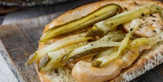 На скибочку хліба викласти спочатку курку, а зверху — соломку з огірка, полити трохи соусом і посипати чорним перцем.