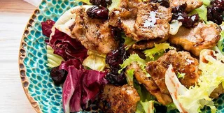 У салатник викласти листя салату, зверху — м'ясо, заправити все вишневим соусом.