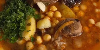 М'ясо залити холодною водою, довести до кипіння, зменшити вогонь і варити на слабкому вогні приблизно годину, знімаючи пінку. Нут відварити в окремій каструлі хвилин 20, потім процідити і додати в м'ясо. Можна його відварити в бульйоні з м'ясом, додавши його через хвилин 40 після закипання м'яса.