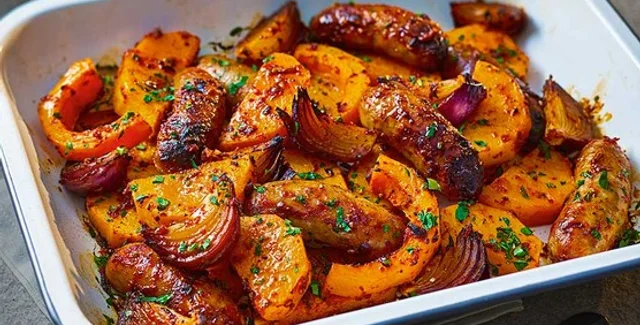 Осіння ситна страва: запечений гарбуз із ковбасками та особливою гострою приправою