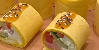 З огірка і помідора вийняти м'яку середину, щоб менше було вологи, і тортилья не розм'якла. Усі інгредієнти для начинки порізати тонкими довгими брусочками. На тортильї обрізати два краї та викласти вершковий сир і начинку, як на відео. Згорнути начинку в тугий рулет і порізати на порційні шматки. Подавати, поливши соусом і посипавши кунжутом.