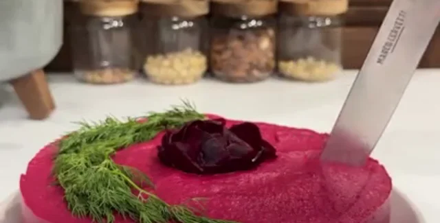 Родзинкою цього салату є буряковий мус, який щільно вкриває його і надає йому цікавого та ефектного вигляду.