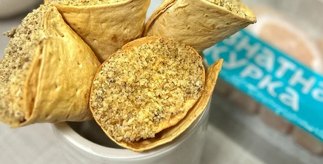 Наповнити тортильї начинкою та обваляти верхівку в подрібнених горіхах. Хрусткі конуси зі смачною начинкою готові.