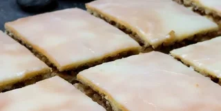 Дістати, перевернути і залити глазур'ю. Для глазурі до цукрової пудри додати лимонний сік, перемішати і поступово додавати молоко, щоб відрегулювати густоту. Обрізати краї і дати охолонути.