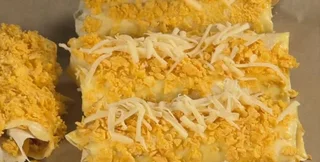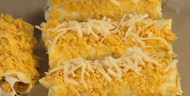 На круглий лаваш викласти начинку і загорнути. Обваляти спочатку у збитому яйці, а потім — у кукурудзяних пластівцях і викласти на деко, застелене пергаментом. Зверху ще посипати рештою натертого сиру. Випікати в розігрітій духовці приблизно 15-20 хвилин.