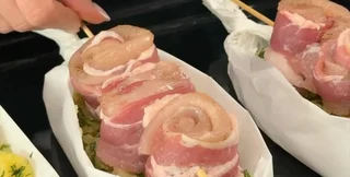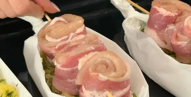 Кожне філе порізати вздовж навпіл, зверху викласти бекон і згорнути в рулет, як показано на відео.