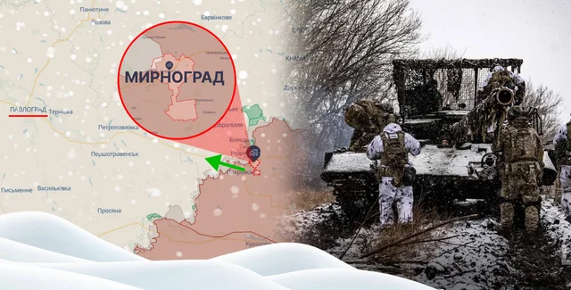 Оборона Мирнограду (Донецька область) виявилася на межі завершення — місто майже повністю поглинають підрозділи російських військ, заявляють аналітики DeepState. За їхніми оцінками, російські сили поступово просуваються й у північну частину Покровська, що створює критичний тиск на українські оборонні позиції.