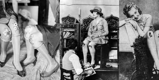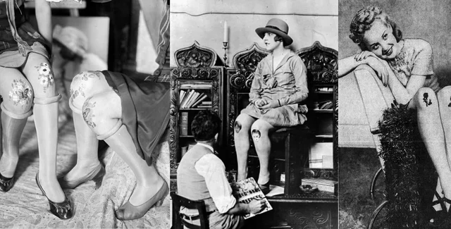 На кількох архівних фото зображені красуні в нарядах того часу, але найцікавішою на знімках є зона макіяжу. На їхніх колінах красуються малюнки у вигляді квіткових візерунків, портретів тощо. При цьому панчохи спущені трохи нижче коліна, а довжина спідниць залишає цю частину тіла відкритою.