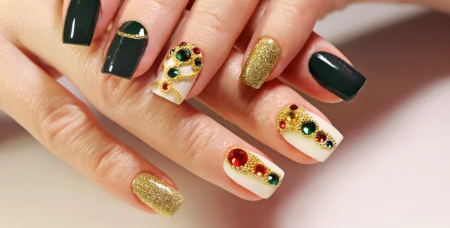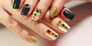 Зелений колір у манікюрі вже який сезон поспіль не втрачає своєї актуальності, а в новорічну ніч насичене або темно-зелене покриття нігтів стане чудовим завершенням святкового образу. Як будь-який темний колір, зелений "любить" поєднання із золотом та сріблом. Хороший варіант покриття — "травневий жук" або ефект "котяче око". Такий манікюр не вимагає додаткових елементів і виглядає більш ніж самодостатньо.