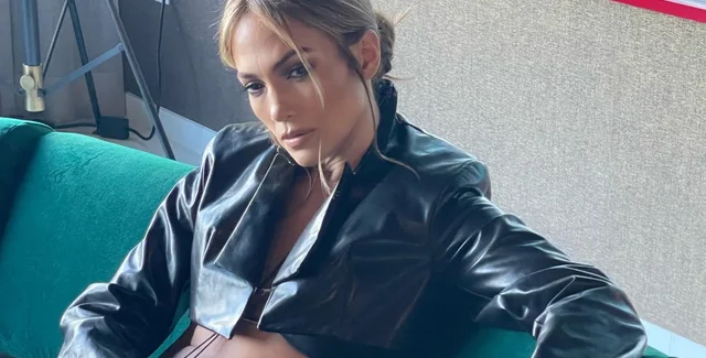 Зверху Джей Ло накинула укорочену шкіряну куртку з довгими рукавами.
