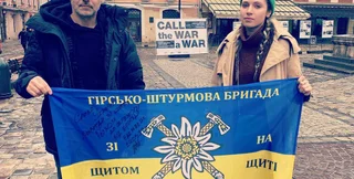 На фото 46-річний фронтмен гурту "Океан Ельзи" та його донька тримають синьо-жовтий прапор гірсько-штурмової бригади "Едельвейс".