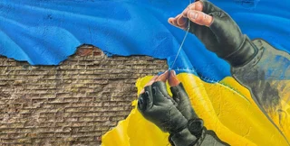На муралі зображено руки людини у формі військового, які намагаються зшити Україну в одне ціле, відображаючи сьогоднішню боротьбу країни з агресором.