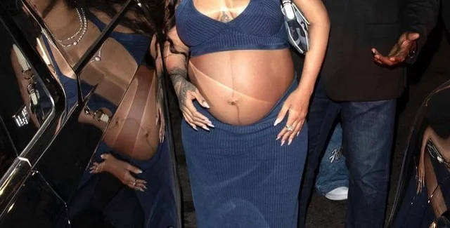 Ріанну помітила на виході з ресторану Nobu у Лос-Анджелесі. На вагітній зірці був темно-синій кроп-топ і приталена спідниця в підлогу. На ногах співачки були білі кеди adidas. Як аксесуари вона обрала масивні аксесуари та сумку Dior Saddle. А доповнила образ кепка в тон наряду.