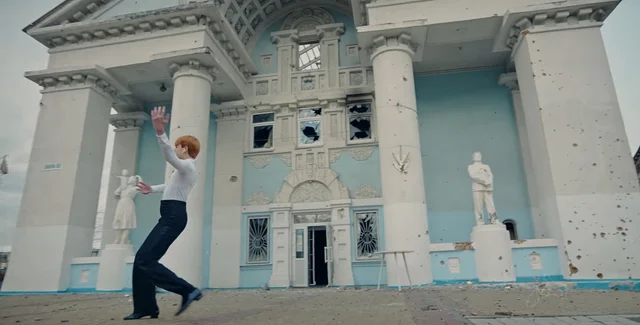 Кадр із кліпу, знятий у зруйнованого ЗС РФ Будинку культури в Ірпені | Фото: Скриншот