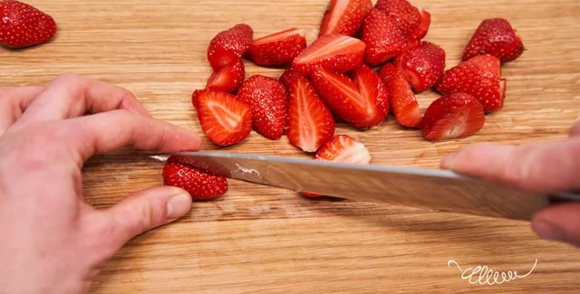 У цей час 200 г полуниці миємо, висушуємо паперовим рушником та ріжемо половинками.