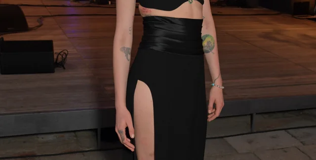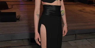 Для появи знаменитість вибрала чорний топ, оголивши живіт, і спідницю максі з високою талією з ефектними розрізами на стегнах. Образ модель доповнила грубими черевиками на шнурівці, а також багатошаровим намистом з підвісками та браслетом із бісеру.