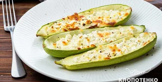 У мисці змішуємо сир і терту моцарелу до однорідного стану, солимо та перчимо до смаку. Наповнюємо сирною сумішшю кабачки і відправляємо в духовку на 20 хвилин.