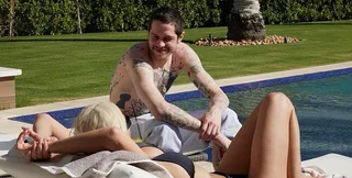 На знімках пара ніжиться біля басейну, причому якщо Піт — у спортивних штанах, то Кім обрала відверте чорне бікіні. На одному з фото Піт нахилився над коханою, демонструючи на камеру свої татуювання на спині, а на іншому кадрі колишня дружина Каньє Веста вперлася ногами в груди свого нового бойфренда.