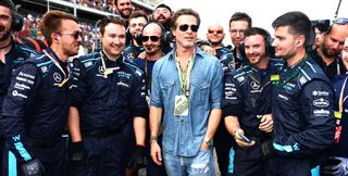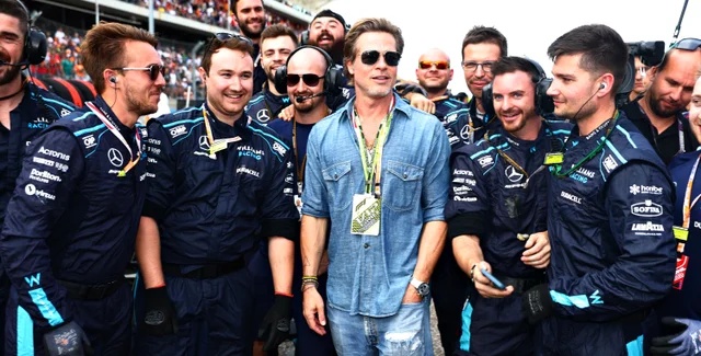 Бред Пітт позував у гаражі команди Mercedes, де він проводив час із перегонником Льюсом Гамільтоном та генеральним директором Apple Куком.