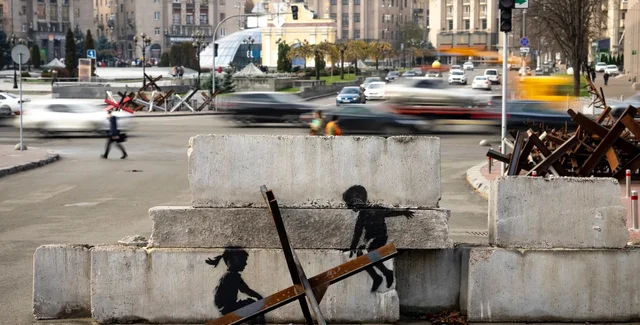 У Києві біля бетонних блоків біля Майдану Незалежності він намалював двох дітей, котрі гойдаються на протитанковому їжаку, як на гойдалках, а також використав зображення пеніса, який хтось менш талановитий залишив на стіні історичної будівлі в центрі Києва та домалював до нього броньовану вантажівку з російською Z та солдатами ЗС РФ.