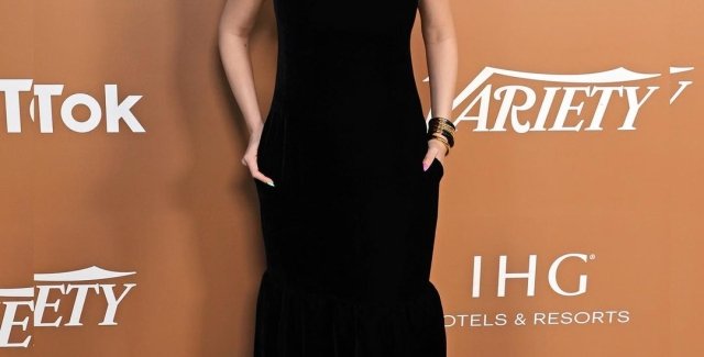 Знаменитість була одягнена в елегантну, але просту маленьку чорну сукню від Totême. Сукня без рукавів була зшита з м'якого оксамиту і скроєна за вигинами її шикарної фігури. Поділ закінчувався трохи вище її кісточок, оголюючи чорні вінілові шльопанці, які вона взула на ноги.
