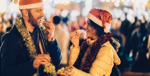 А ще набивають рот виноградом. Кожна виноградина проковтується на кожен удар курантів і супроводжується загадуванням новорічного бажання. Тож на вулицях навіть продаються спеціальні стаканчики з 12 виноградинами, щоб до бою курантів бути у всеозброєнні. У Мадриді люди збираються з гронами винограду під вежею Пуерта-дель-Соль.