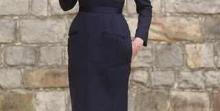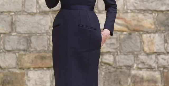 Дизайнерка обрала темно-синій ансамбль, дуже схожий на той, у якому вона приймала орден Британської імперії у 2013 році.