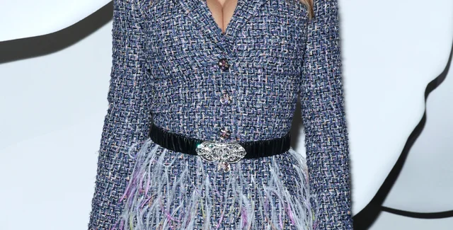 У Grand Palais Éphémère у столиці Франції знаменитість була з ніг до голови у речах від іменитого бренду. Ансамбль оскароносної акторки складався із синьо-чорно-білої твідової мінісукні з довгими рукавами та коміром із загостреними лацканами. Виріб, застебнутий блискучими ґудзиками спереду, був доповнений чорним шкіряним шкірним ременем, ефектно прикрашеним тонким різнокольоровим пір'ям у стилі омбре й увінчаним філігранною пряжкою з блискучих кристалів.