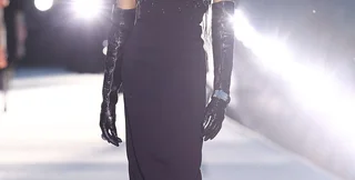 На подіум британська супермодель вийшла у чорній сукні до щиколотки з вирізом на шиї та вирізом у формі серця.